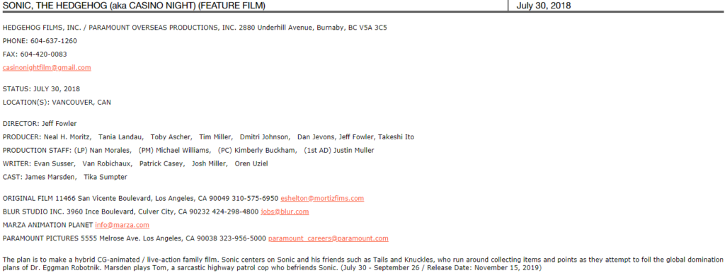 Um documento, além do site da Creativebc, sugerem que o nome do filme será “Casino Night”, mas isso pode ser apenas um codinome. O boletim do site Creativebc menciona o Tails e o Knuckles como parte do filme, além de explicar o básico do que é a franquia Sonic:
