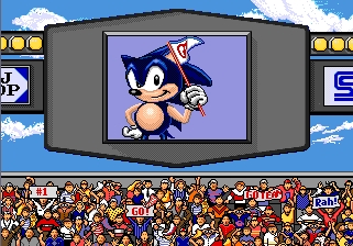 Sonic aparece no placar levantando uma bandeira escrita "Go!". |
